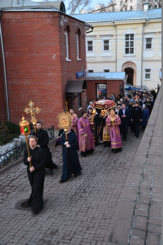 После пения великого славословия, святая Плащаница крестным ходом была обнесена вокруг храма с пением погребального песнопения «Святый Боже…»
